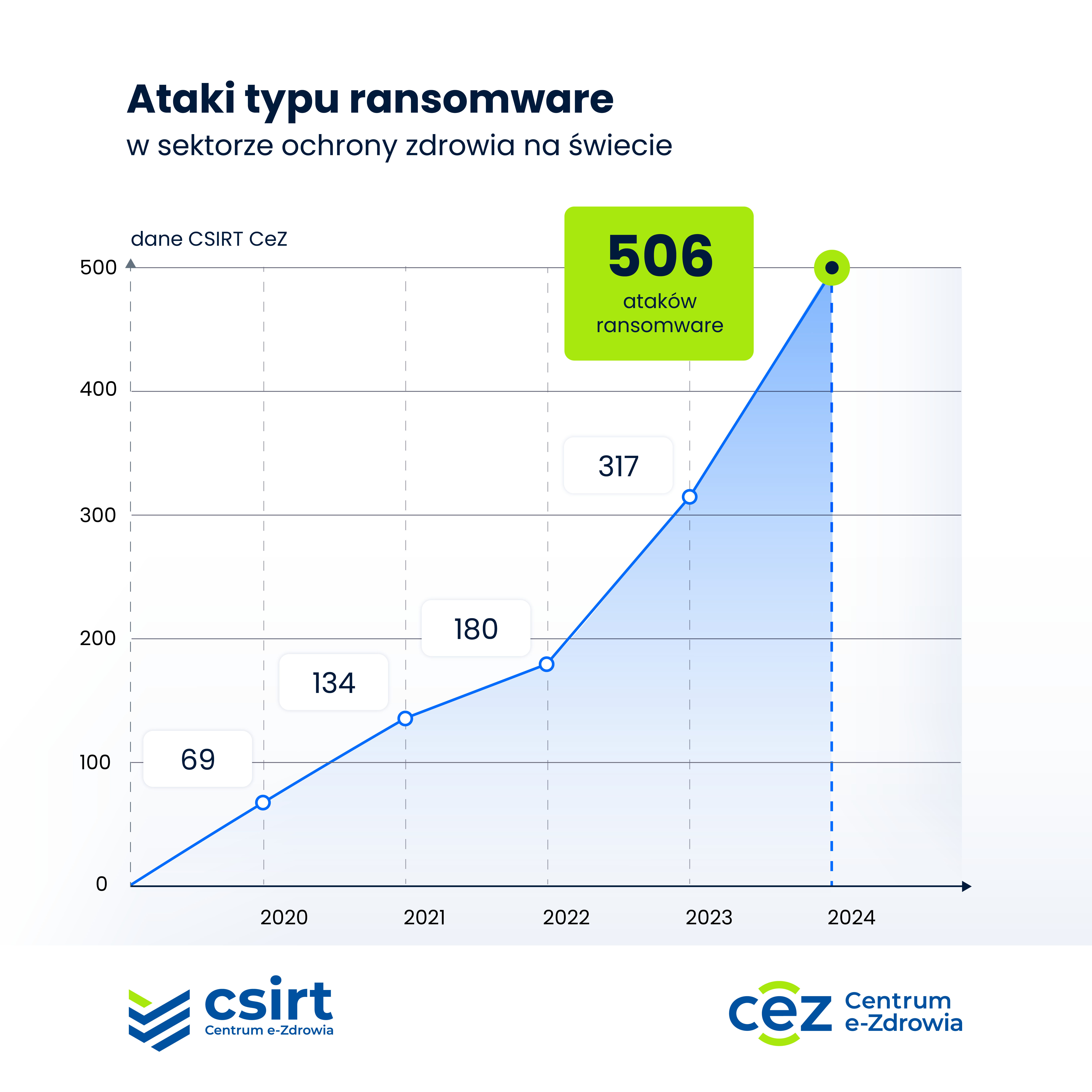 Z opublikowanych danych wynika, że liczba ataków typu ransomware na placówki ochrony zdrowia na świecie wzrosła drastycznie – z 69 incydentów w 2020 roku do 506 w 2024 roku. To ponad siedmiokrotny wzrost na przestrzeni zaledwie pięciu lat. Ta dynamika jest alarmująca, a same liczby pokazują, że cyberprzestępcy coraz częściej celują w systemy medyczne, wykorzystując ich wrażliwość i znaczenie dla społeczeństwa.