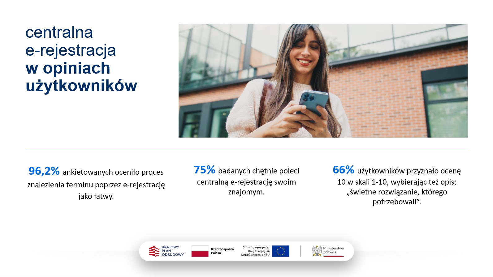 Ankieta przeprowadzona wśród użytkowników centralnej e-rejestracji pokazuje, że rozwiązanie zostało bardzo dobrze przyjęte przez pacjentów. Aż 96,2% respondentów oceniło proces znalezienia terminu wizyty jako łatwy, a ponad 70% użytkowników uznało cały proces zapisywania się za łatwy lub bardzo łatwy. 75% deklaruje, że poleci centralną e-rejestrację rodzinie lub znajomym. Jednocześnie 86% pacjentów poradziło sobie z rejestracją samodzielnie już przy pierwszym kontakcie – bez pomocy innych osób. W skali od 1 do 10 aż 66% użytkowników przyznało też e-rejestracji maksymalną ocenę 10, wybierając równocześnie komentarz: „świetne rozwiązanie, którego potrzebowałem”.