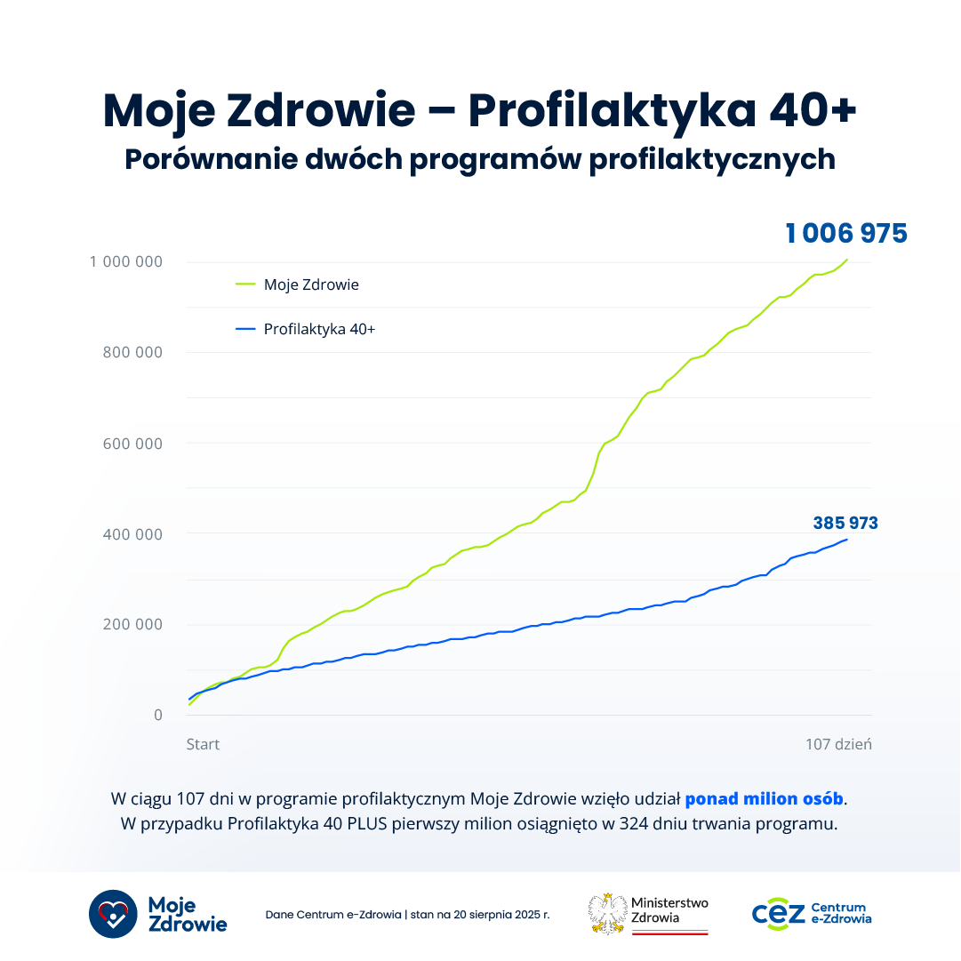 W niecałe cztery miesiące od startu programu profilaktycznego Moje Zdrowie zgłosiło się do niego ponad milion osób. Najchętniej badają się kobiety i mężczyźni między 20 a 40 rokiem życia (w sumie 53%), a najczęstszym sposobem przystąpienia do programu jest wypełnienie ankiety zdrowotnej w Internetowym Koncie Pacjenta (IKP – 42%) i jego wersji mobilnej – aplikacji mojeIKP (31%).