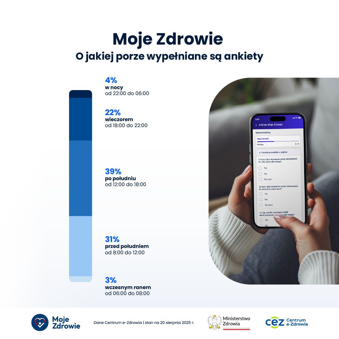 Na popularność programu Moje Zdrowie wpływ ma m.in. wygodny i szybki dostęp do niego. Dzięki integracji z IKP i mojeIKP pacjenci mogą wypełnić ankietę zdrowotną w dowolnym miejscu i czasie. I rzeczywiście tak się dzieje. Większość ankiet wypełniana jest w formie cyfrowej, w tym część w późnych godzinach popołudniowych, a nawet w nocy (w sumie 26%).