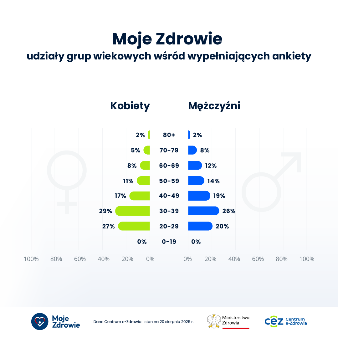 Najliczniejszą grupą wśród wypełniających ankiety w programie Moje Zdrowie są kobiety w wieku 20–59 lat. Z tej grupy pochodzi 58% wszystkich zgłoszeń do programu. To sygnał, że Polki są świadome znaczenia profilaktyki i chętnie korzystają z cyfrowych narzędzi zdrowotnych.