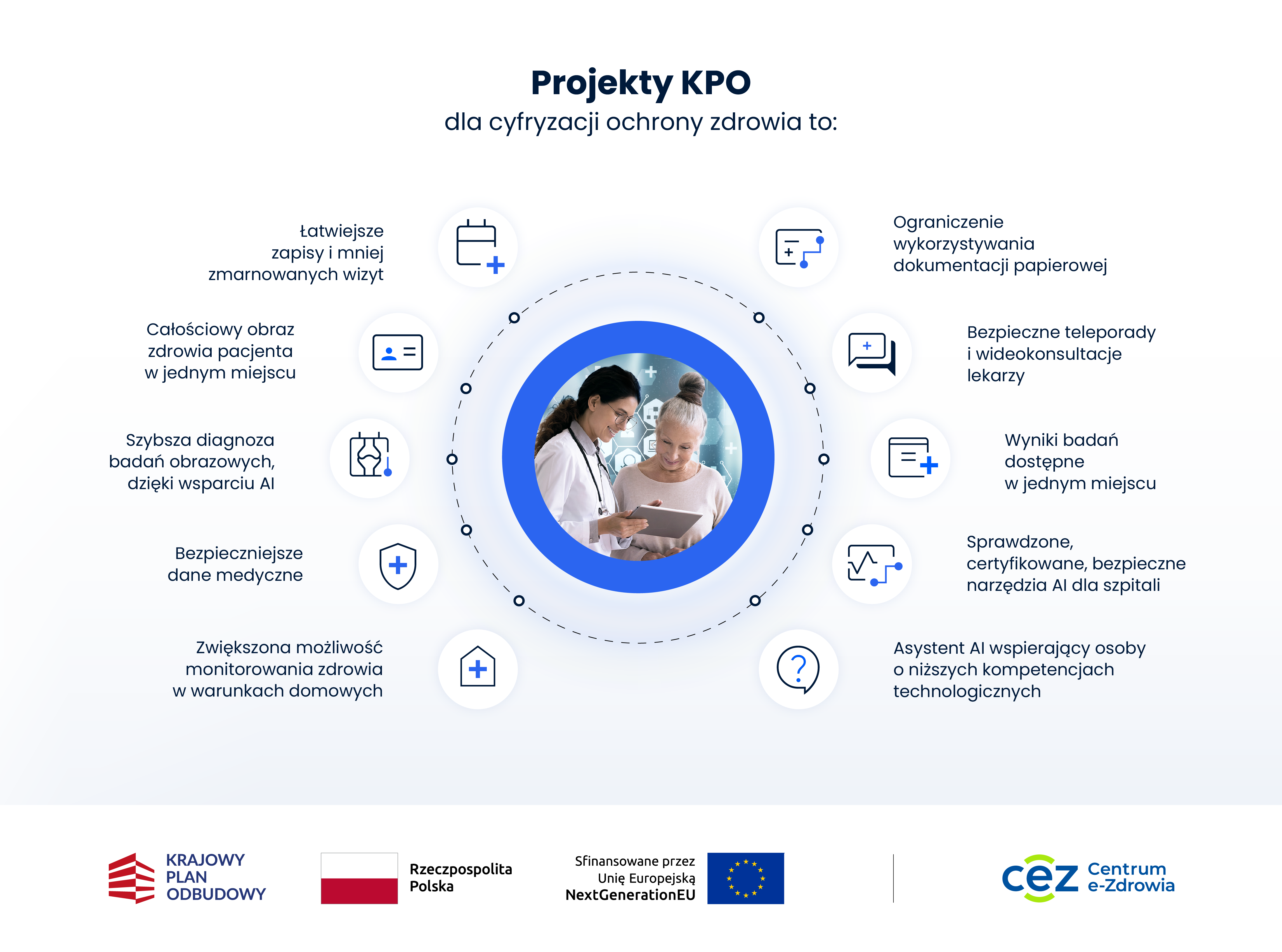 Centrum e-Zdrowia otrzyma ponad 1,2 mld zł na realizację zadań w ramach Krajowego Planu Odbudowy i Zwiększania Odporności (KPO). Zrealizuje kluczowe projekty, które przyspieszą transformację cyfrową ochrony zdrowia w Polsce. Najważniejsze cele to: wsparcie pracowników ochrony zdrowia (m.in. narzędziami AI), rozwój systemu e-zdrowia (m.in. cyfryzacja dokumentów, centralne repozytorium) oraz korzyści dla pacjentów (m.in. wygodniejsze umawianie badań).